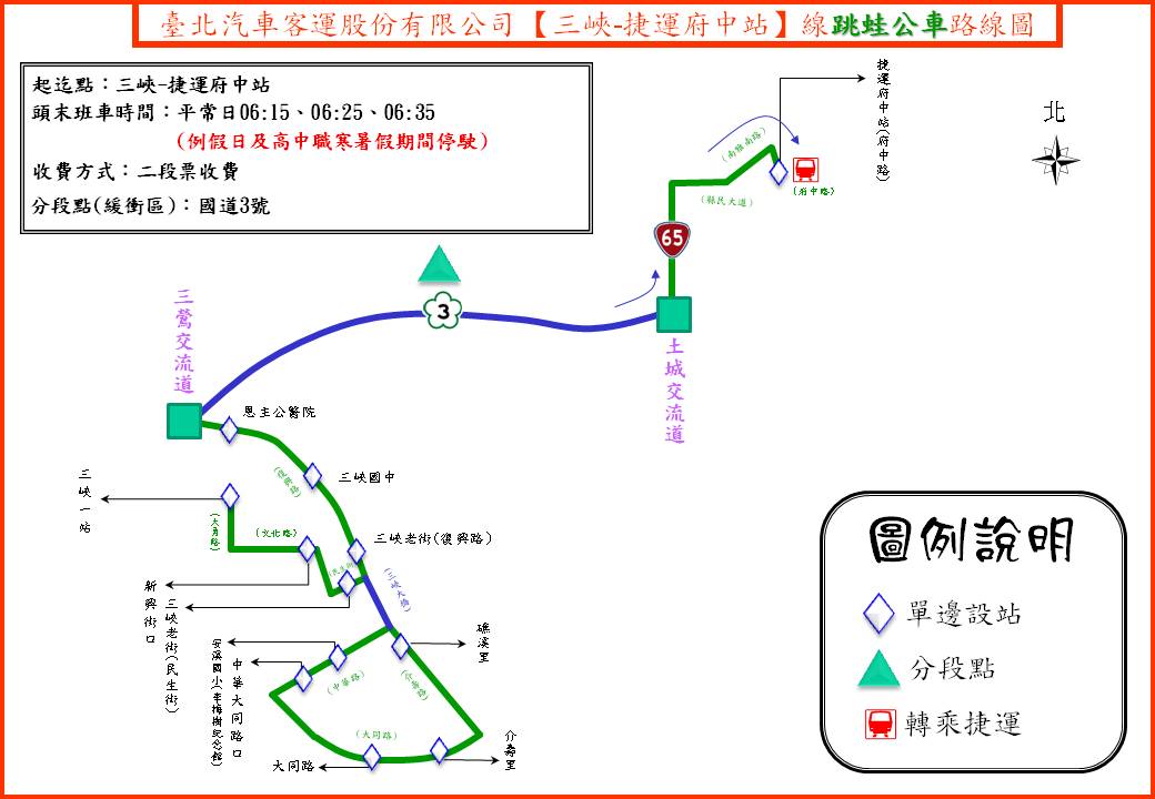| 頭末班車時間:平常日:006:15、06:25、06:35班次 (三峽端單邊發車) |